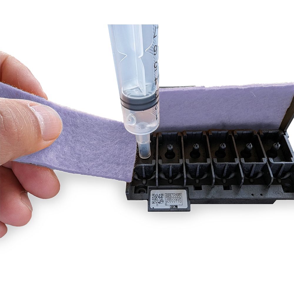 Simply place a Splash Absorbing Strip in the printhead before you flush or change dampers. You can also hold a Splash Absorbing Strip close to your syringe when you flush. It is recommended to use 2 Splash Absorbing Strips at a time for best prevention. See photos below.