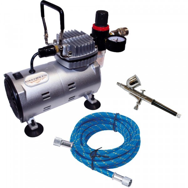 This item includes both the Inkedibles HEAVY DUTY compressor unit AND the Inkedibles double action airbrush as well as a heavy duty airhose to connect the airbrush to the compressor (everything you need to do your own airbrushing, except for the airbrush inks). The edible airbrush inks are sold separately, and also as a separate bundle.
