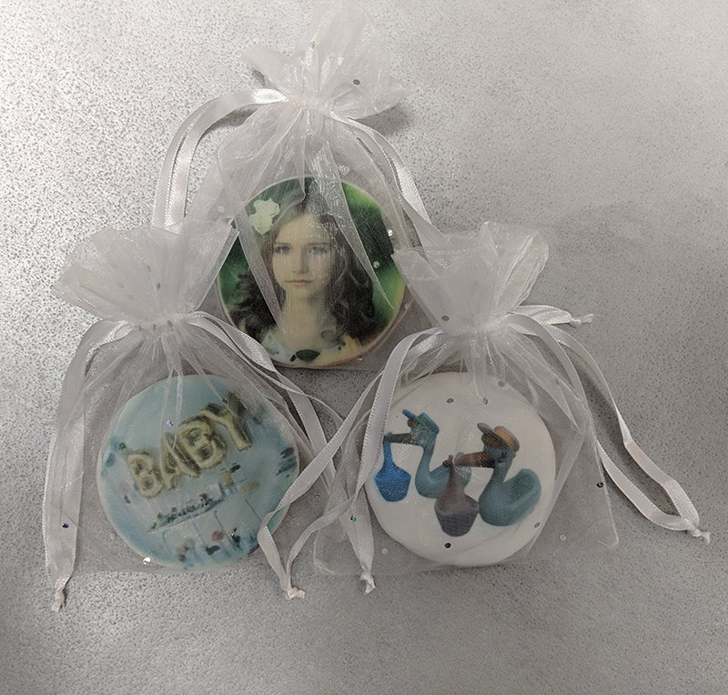 Each custom printed cookie comes packed in its own individual organza bag which is decorated with tiny, round holographic dots for a hint of sparkle. Comes with a drawstring opening and coordinating double ribbon tie. Perfect for weddings, baby showers, birthday parties, baptisms, party decor, party favors and small gifts.